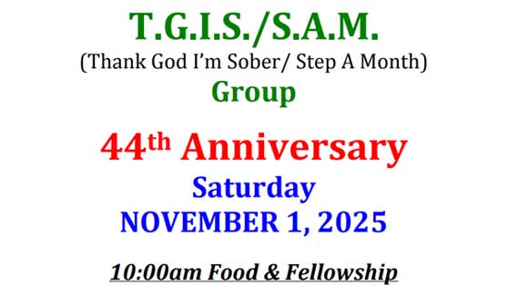 Come Celebrate “TGIS” Thank God I’m Sober and the “SAM” Step A Month Groups of Alcoholics Anonymous celebrate 44 years of Love and Service carrying the A.A. message in the Doylestown area.